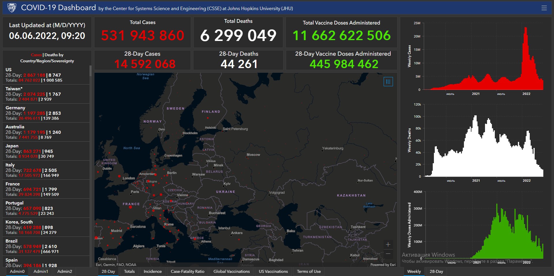 Всего в мире с начала пандемии коронавирусом заразились 531 миллион 943 тысячи 860 человек. Больше всего в США (84 миллиона 762 тысячи 22), Индии (43 миллиона 176 тысяч 817), Бразилии (31 миллион 137 тысяч 479), Франции (29 миллионов 834 тысячи 390), Великобритании (22 миллиона 493 тысячи 328), России (18 миллионов 83 тысячи 984), Турции (15 миллионов 72 тысячи 747), Аргентине (9 миллионов 276 тысяч 618), Иране (7 миллионов 232 тысячи 731), Колумбии (6 миллионов 109 тысяч 105), Испании (12 миллионов 403 тысячи 245), Италии (17 миллионов 505 тысяч 973) и Германии (26 миллионов 496 тысяч 611).