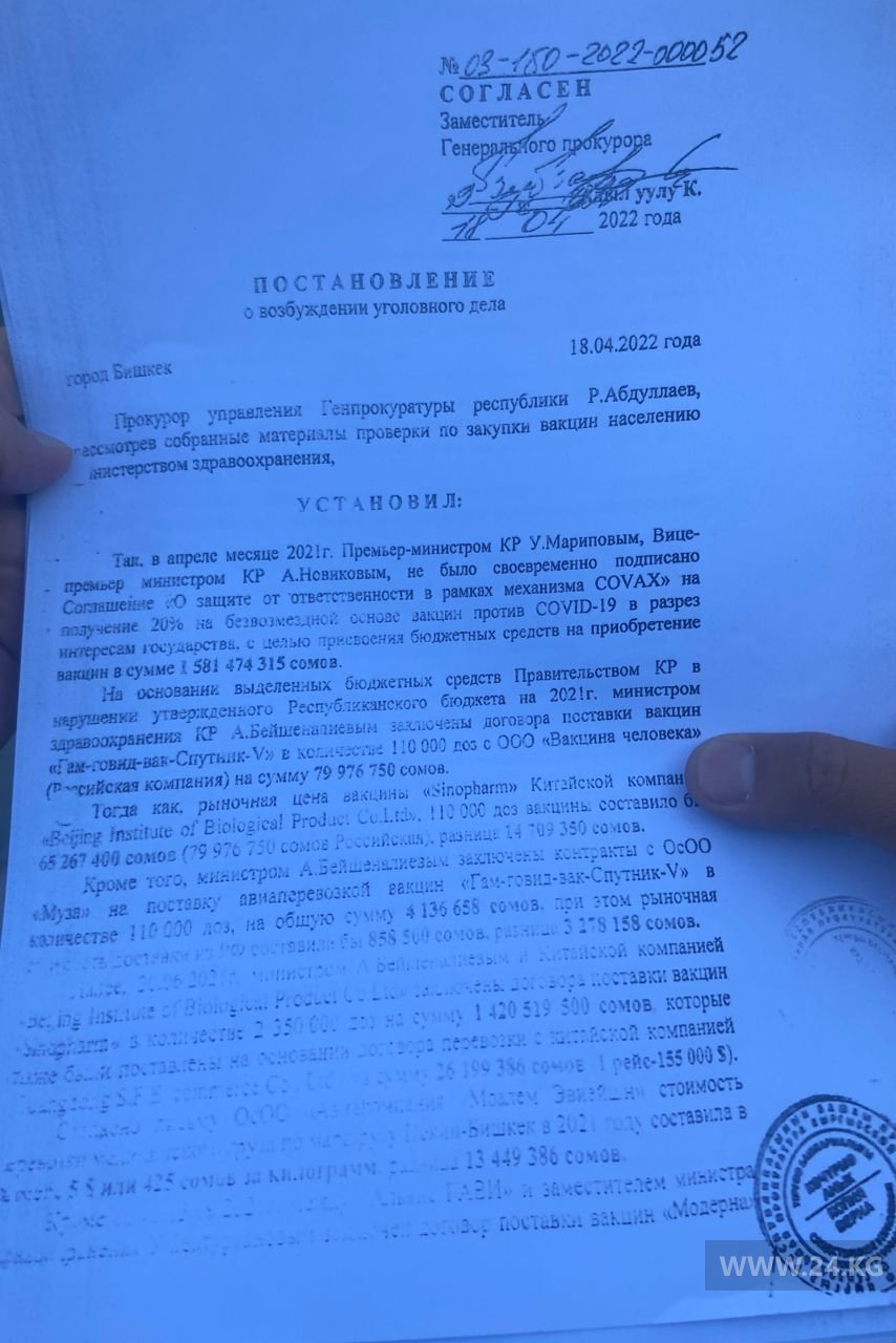 В частности, указано, что «в апреле 2021 года премьер-министром Улукбеком Мариповым и вице-премьер-министром Артемом Новиковым не было своевременно подписано соглашение «О защите от ответственности в рамках механизма COVAX» на получение 20 процентов на безвозмездной основе вакцин против COVID-19 в разрез интересам государства, с целью присвоения бюджетных средств на приобретение вакцин на сумму 1 миллиард 581 миллион 474 тысячи сомов».Напомним, Генеральная прокуратура возбудила семь уголовных дел в отношении министра здравоохранения Алымкадыра Бейшеналиева. Одно уголовное дело возбуждено по статье о коррупции, два — о вымогательстве взятки и четыре — по статьям о злоупотреблении должностным положением и заключении заведомо невыгодного контракта. Помимо главы ведомства, в рамках дела о коррупции при закупке вакцин от COVID-19 задержаны заместитель министра Улук-Бек Бектурганов, директор Республиканского центра иммунопрофилактики Гульбара Ишенапысова и заведующий отделом лекарственных средств и медицинских изделий Султан Сатарбеков.