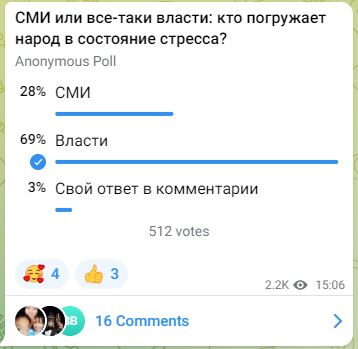 В Telegram-канале 69 процентов проголосовавших в стрессе винят власть, 28 процентов — СМИ, 3 процента считают, что отчасти виноват сам народ — такую власть выбрал и не те масс-медиа читает.