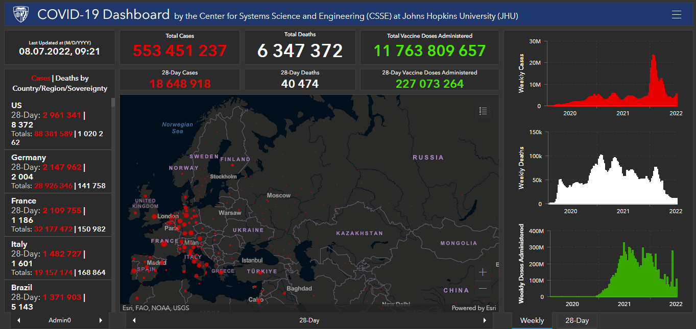 Всего в мире с начала пандемии коронавирусом заразились 553 миллиона 451 тысяча 237 человек. Больше всего в США (88 миллионов 381 тысяча 589), Индии (43 миллиона 566 тысяч 739), Бразилии (32 миллиона 759 тысяч 730), Франции (32 миллиона 177 тысяч 472), Великобритании (23 миллиона 86 тысяч 445), России (18 миллионов 182 тысячи 578), Турции (15 миллионов 180 тысяч 444), Аргентине (9 миллионов 394 тысячи 326), Иране (7 миллионов 244 тысячи 694), Колумбии (6 миллионов 198 тысяч 848), Испании (12 миллионов 890 тысяч 2), Италии (19 миллионов 157 тысяч 174) и Германии (28 миллионов 926 тысяч 346).