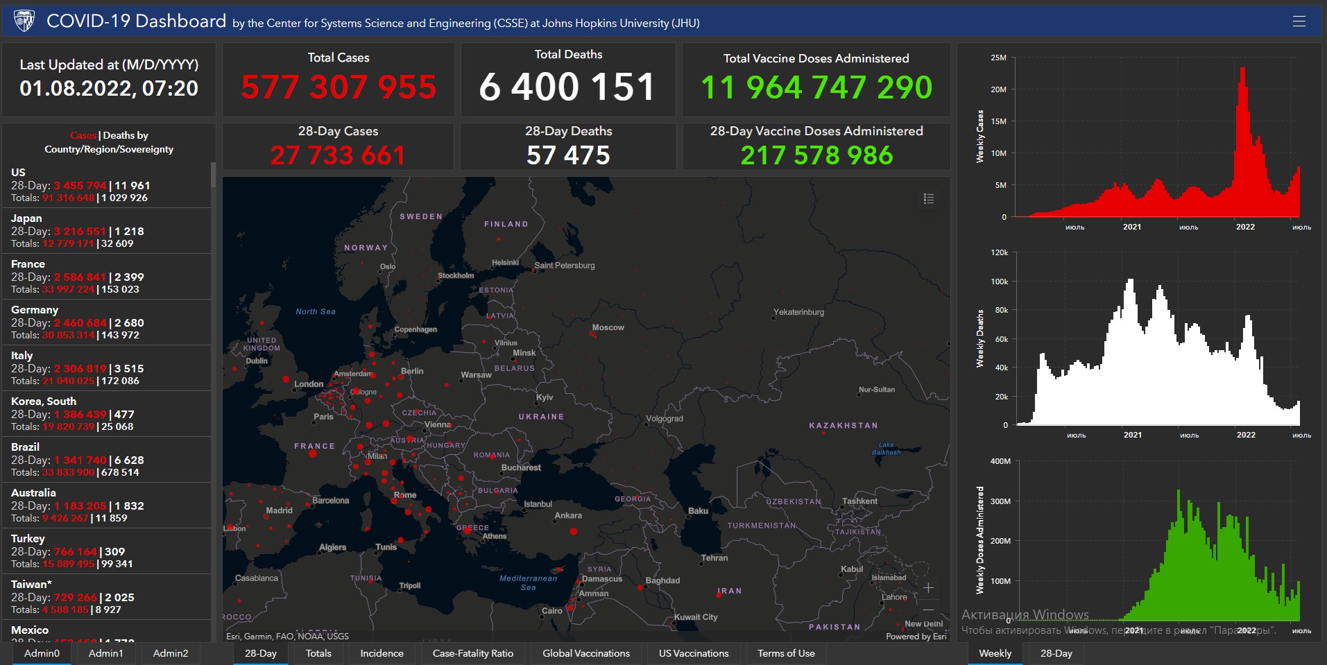 Всего в мире с начала пандемии коронавирусом заразились 577 миллионов 307 тысяч 955 человек. Больше всего в США (91 миллион 316 тысяч 648), Индии (44 миллиона 19 тысяч 811), Бразилии (33 миллиона 833 тысячи 900), Франции (33 миллиона 997 тысяч 224), Великобритании (23 миллиона 515 тысяч 888), России (18 миллионов 330 тысяч 786), Турции (15 миллионов 889 тысяч 495), Аргентине (9 миллионов 560 тысяч 307), Иране (7 миллионов 391 тысяча 26), Колумбии (6 миллионов 265 тысяч 798), Испании (13 миллионов 226 тысяч 579), Италии (21 миллион 40 тысяч 25) и Германии (30 миллионов 853 тысячи 314).