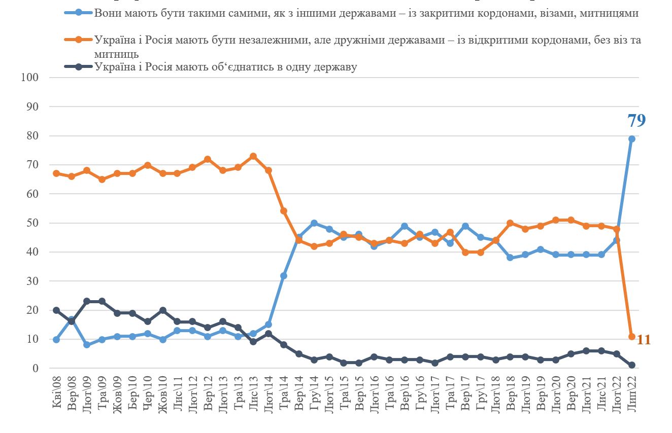 Согласно исследованию, большинство граждан Украины — 79 процента — считают, что между Украиной и Россией должны быть закрыты границы с визами и таможнями. По сравнению с периодом перед полномасштабным вторжением (по состоянию на февраль 2022 года) это количество возросло на 35 процентов (с 44 процента).