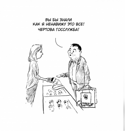 Художник Нурбек Насыранбеков, известный карикатурами на политические темы, изобразил Кудрета Тайчабарова, который, покупая дорогие часы, говорит: «Вы бы знали, как я ненавижу это все! Чертова госслужба!»