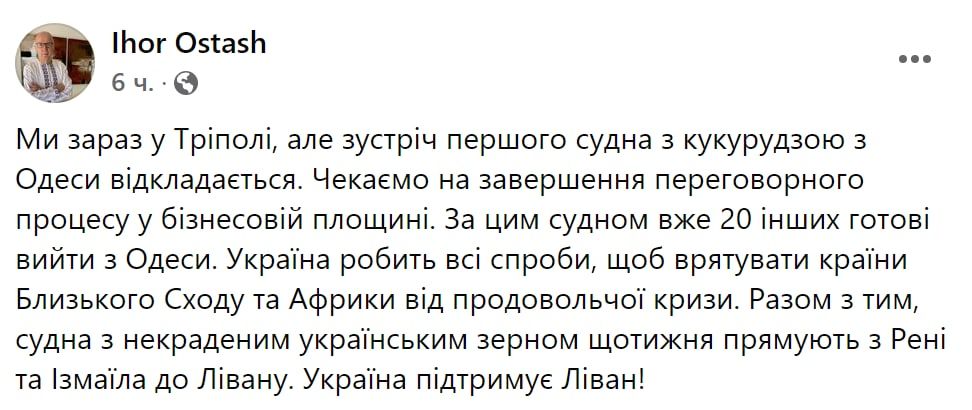 «Мы сейчас в Триполи, но встреча первого судна с кукурузой из Одессы откладывается. Ждем завершения переговорного процесса в бизнес-плоскости», — написал он. Тем не менее, по его словам, еще 20 судов готовы выйти из Одессы.