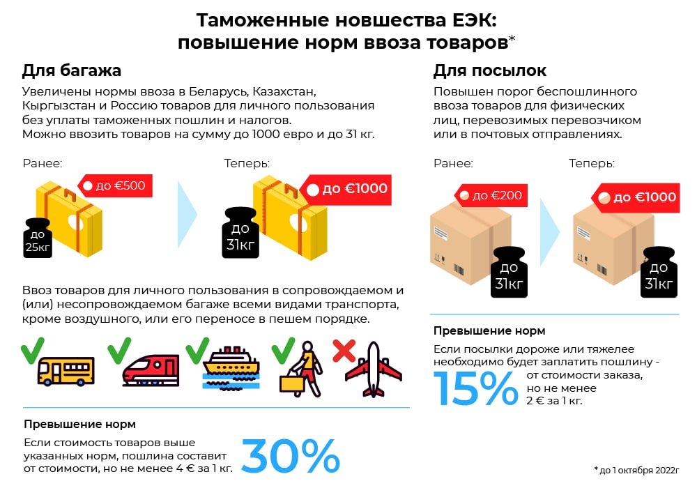 Если стоимость товаров при личном ввозе превысит указанную сумму, то пошлина составит 30 процентов от его цены и не менее 4 евро за 1 килограмм.