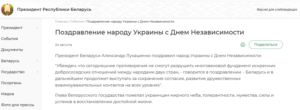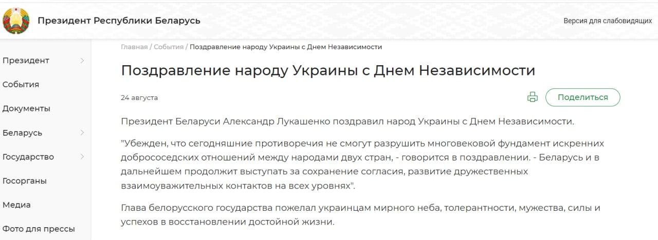 Поздравляя народ Украины с Днем независимости, он пожелал мирного неба.