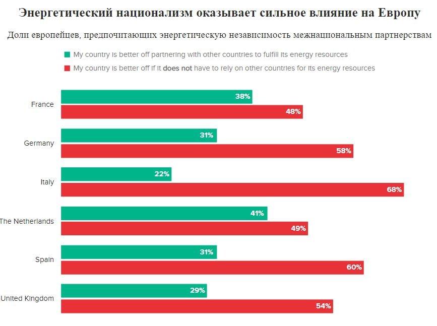 Согласно данным исследования Morning Consult, большинство европейцев считают, что их правительства несут совместную ответственность за диверсификацию энергетических ресурсов Европы (от 49 до 54 процентов). От 22 до 30 процентов считают, что ответственность за это должна нести Германия.