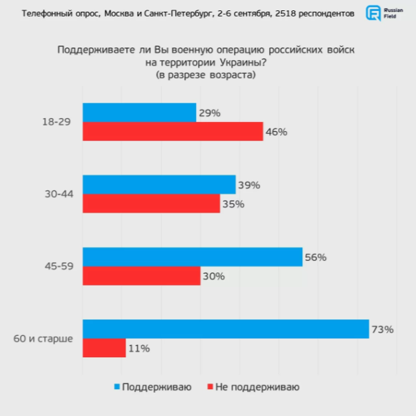Однако доля тех, кто поддерживает СВО, существенно падает в зависимости от возраста респондентов: среди молодых (18-29 лет) не поддерживают СВО 46 процентов, в то время как о поддержке заявляют 29 процентов.