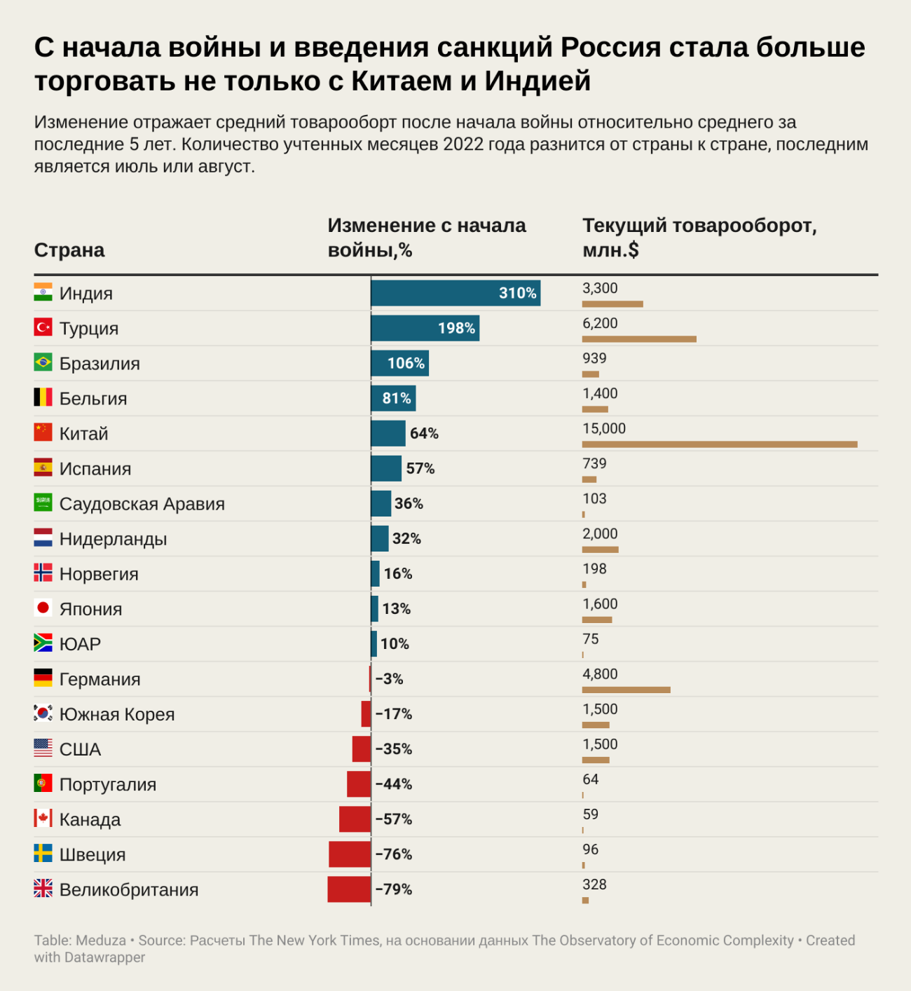 The New York Times изучила товарооборот России с разными странами мира после начала полномасштабной войны. Он вырос не только с Китаем и Индией.
