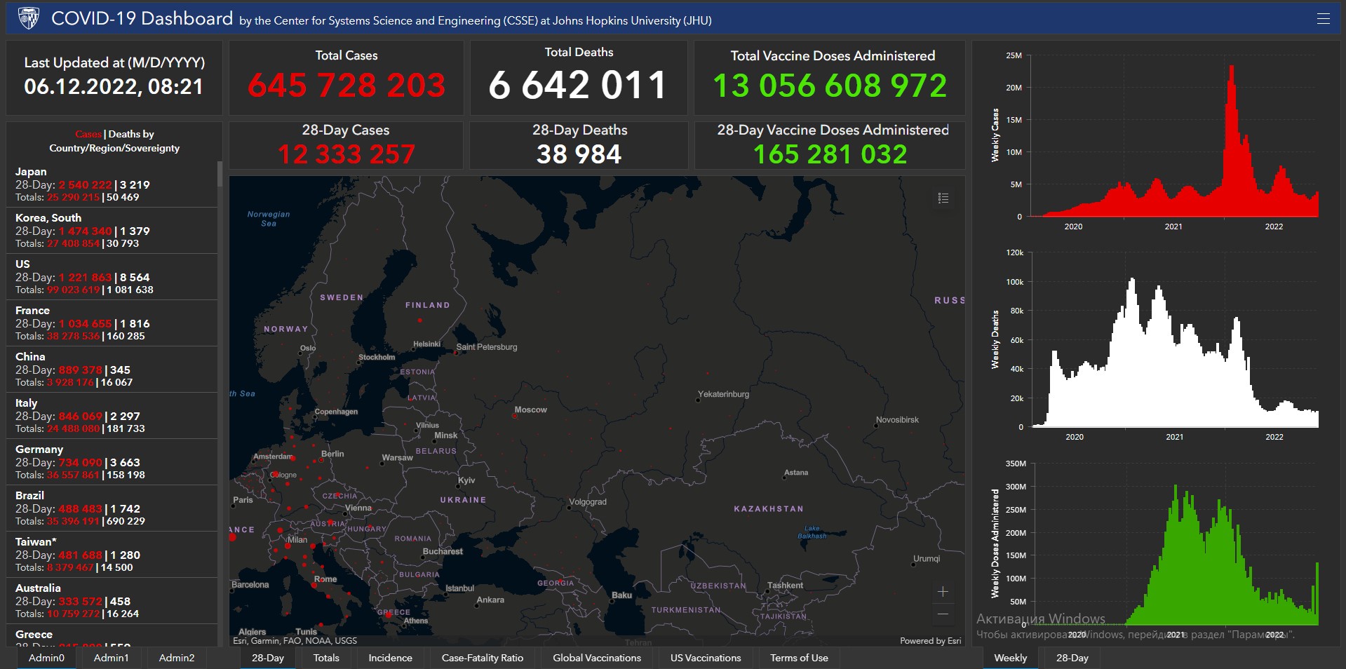 Всего в мире с начала пандемии коронавирусом заразились 645 миллионов 728 тысяч 203 человека. Больше всего в США (99 миллионов 23 тысячи 619), Индии (44 миллиона 673 тысячи 618), Бразилии (35 миллионов 396 тысяч 191), Франции (38 миллионов 278 тысяч 536), Великобритании (24 миллиона 252 тысячи 17), России (21 миллион 316 тысяч 663), Турции (16 миллионов 919 тысяч 638), Аргентине (9 миллионов 739 тысяч 856), Иране (7 миллионов 559 тысяч 855), Колумбии (6 миллионов 314 тысяч 107), Испании (13 миллионов 614 тысяч 807), Италии (24 миллиона 488 тысяч 80) и Германии (36 миллионов 557 тысяч 861).
