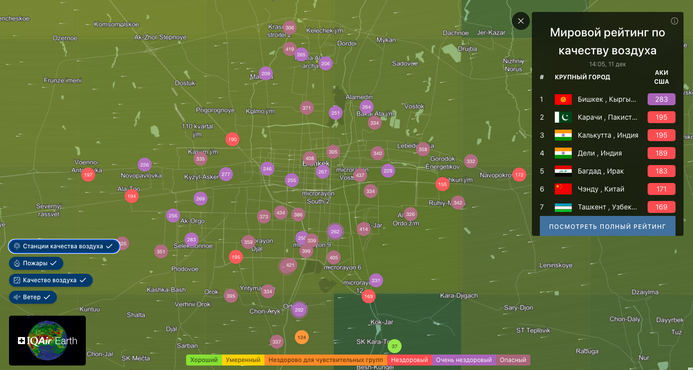 Бишкек возглавил рейтинг крупнейших городов мира World Air Quality по загрязнению воздуха. Столица Кыргызстана на первом месте с показателем воздуха как «очень нездоровый».