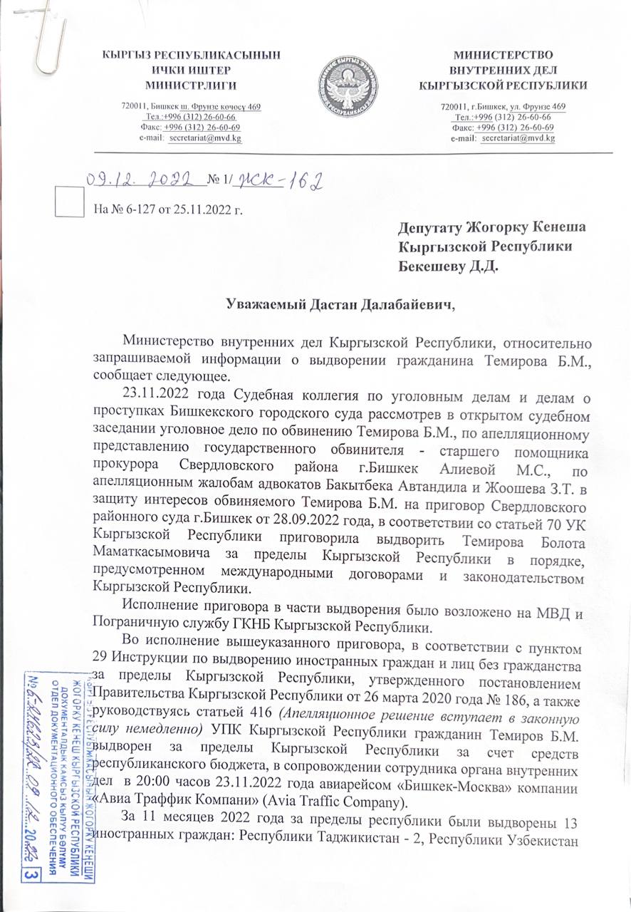 В ответе на запрос депутата, подписанном заместителем министра внутренних дел Нурбеком Абдиевым, указывается, что журналист выдворен за пределы республики за счет средств республиканского бюджета 23 ноября в 20.00 авиарейсом «Бишкек — Москва» компании «Авиа Трафик Компании». Сообщается, что из страны в этом году депортировали 13 иностранцев, в 2021-м — 19. Все они депортированы за свой счет.