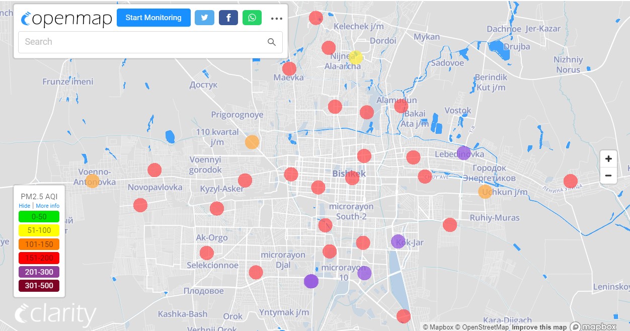 Посольство США в Кыргызстане также установило станцию. Информация обновляется каждый час. Индекс качества воздуха в районе дипломатической миссии «очень нездоровый» — 245 (AQI).