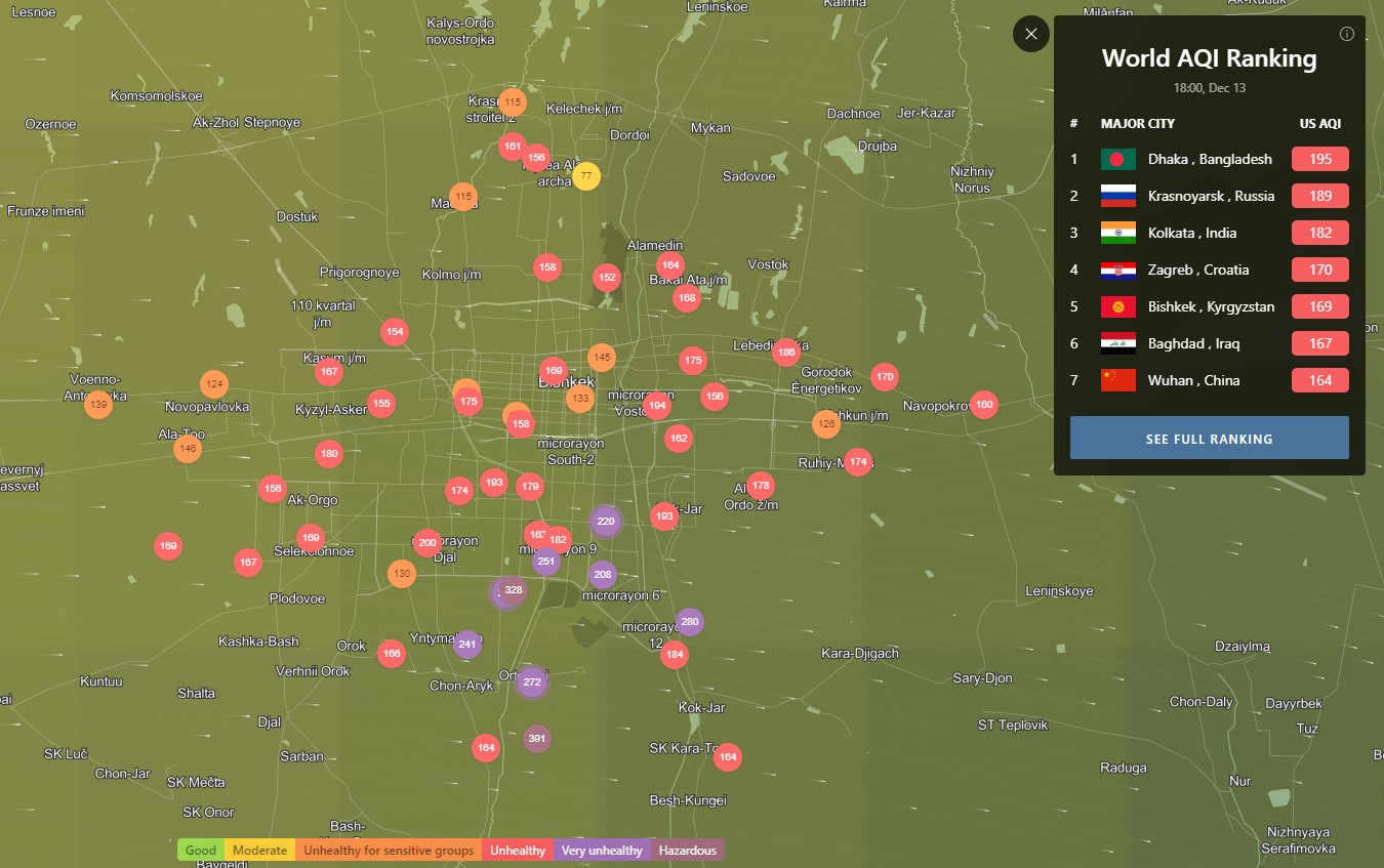 В рейтинге крупнейших городов мира по качеству воздуха World Air Quality Бишкек опустился на пятое место.