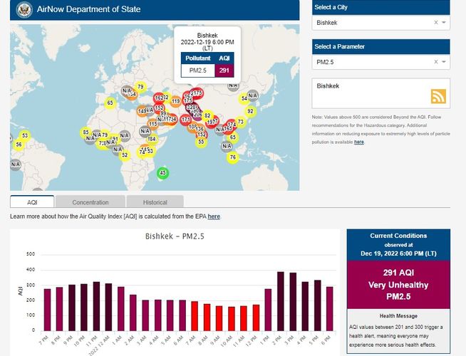 Посольство США в Кыргызстане также установило станцию. Информация обновляется каждый час. Индекс качества воздуха в районе дипломатической миссии «очень нездоровый» — 291 (AQI).