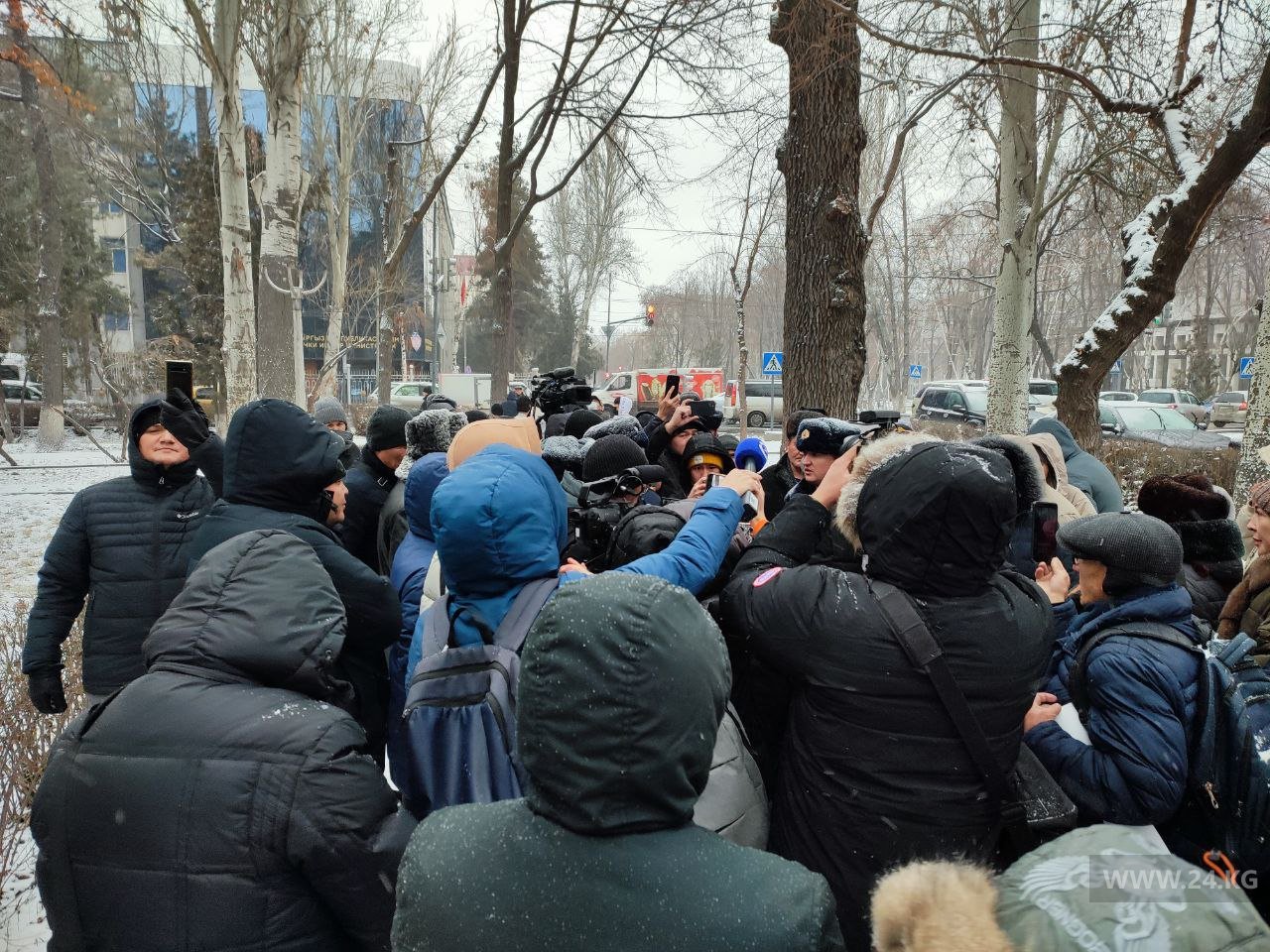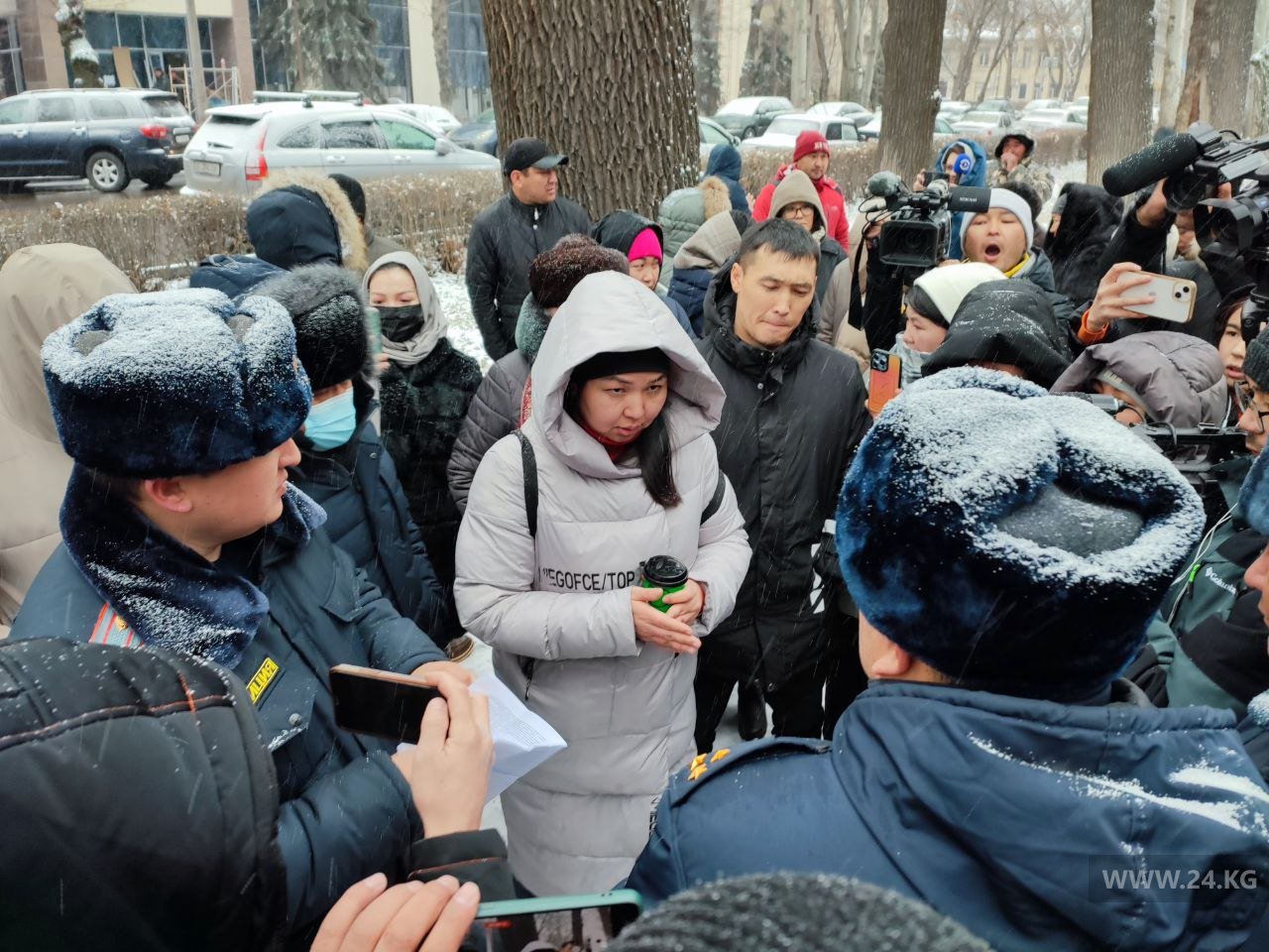 Представители МВД вышли к собравшимся и сообщили о запрете массовых собраний в центре столицы. Такое решение 26 декабря принято Первомайским районным судом Бишкека. Запрет продлится до 31 марта.