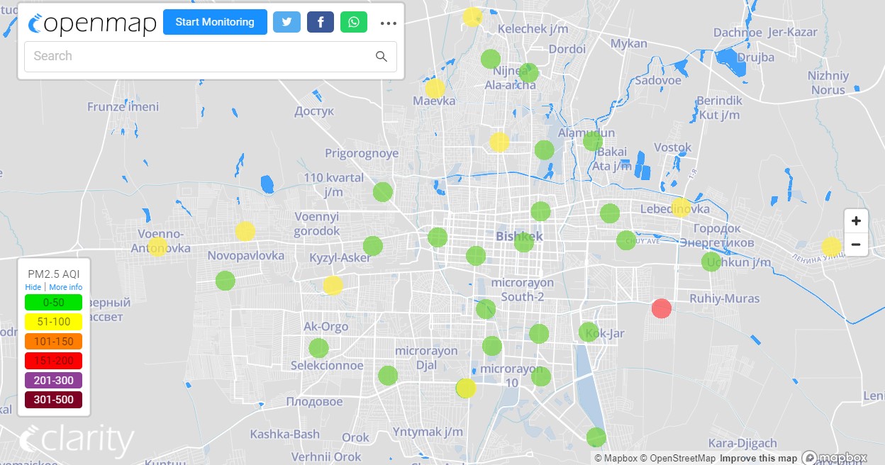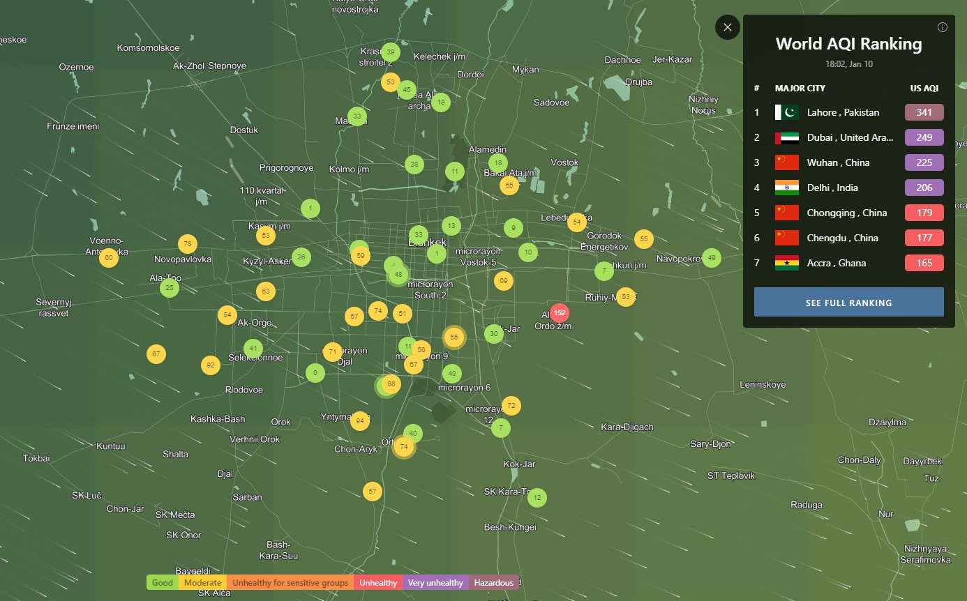В рейтинге крупнейших городов мира по качеству воздуха World Air Quality Бишкек находится на 47-м месте.