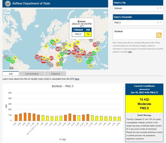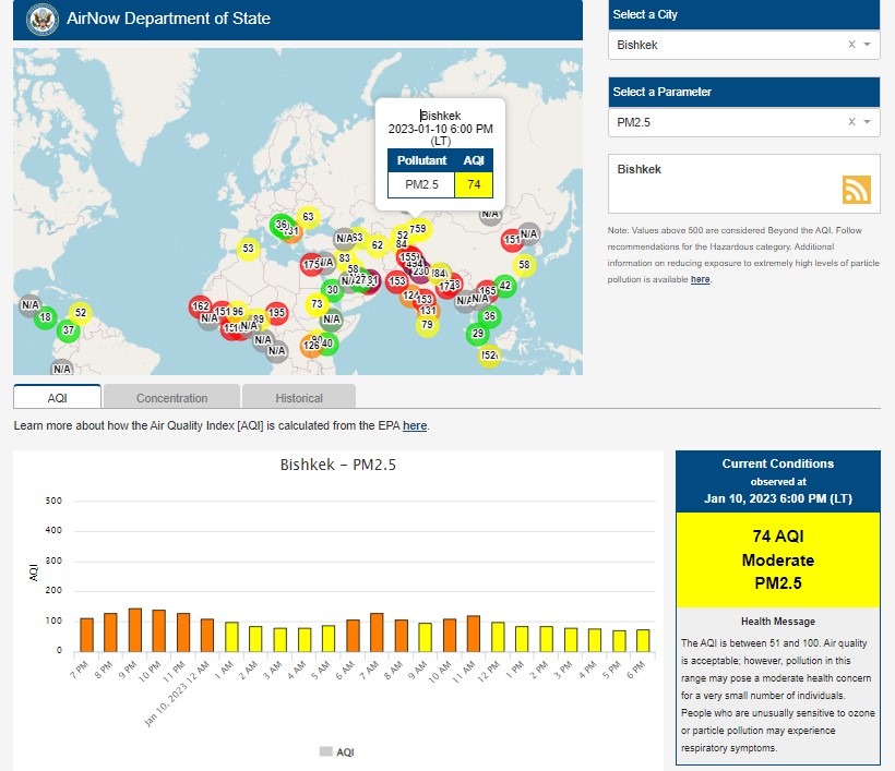 Посольство США в Кыргызстане также установило станцию. Информация обновляется каждый час. Индекс качества воздуха в районе дипломатической миссии «умеренный» — 74 (AQI).