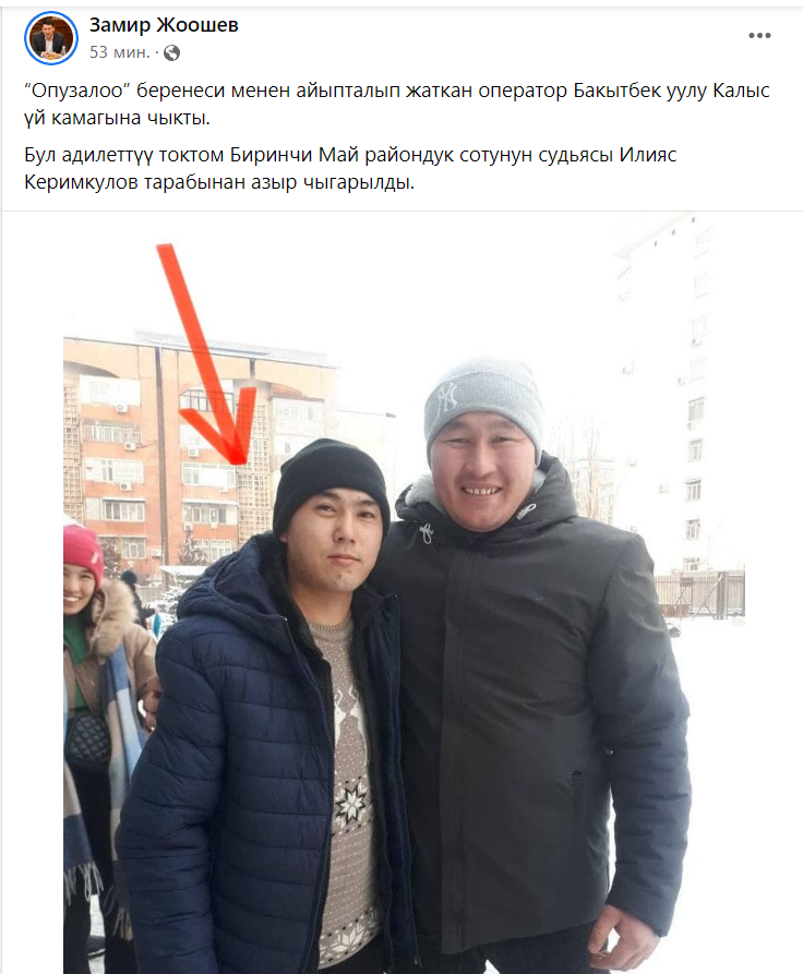 Оператора регионального канала MIR24 Калыса Бакытбек уулу отпустили под домашний арест. Об этом в соцсетях сообщил адвокат Замир Жоошев.