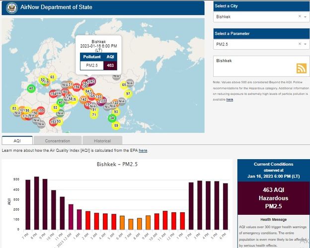 Посольство США в Кыргызстане также установило станцию. Информация обновляется каждый час. Индекс качества воздуха в районе дипломатической миссии «опасный» — 463 (AQI).