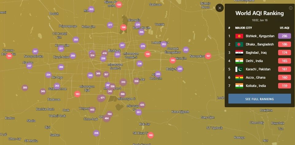 В рейтинге крупнейших городов мира по качеству воздуха World Air Quality Бишкек вновь занял первое место.