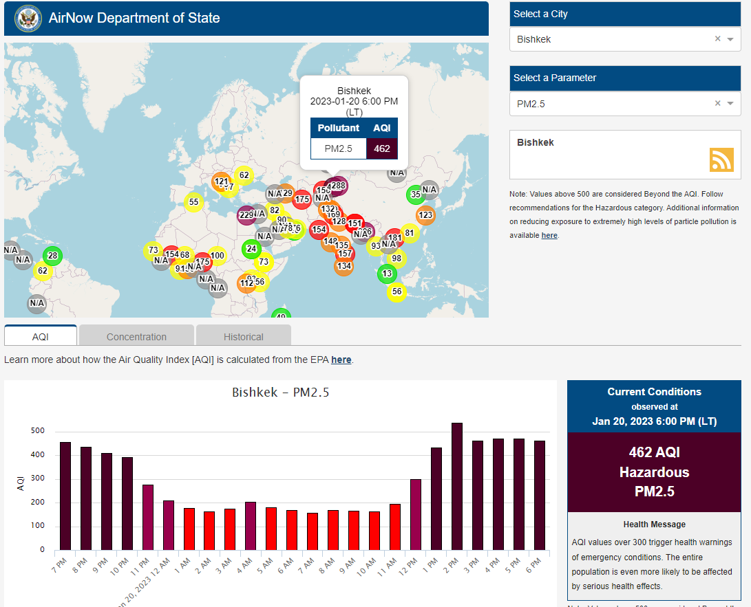 Посольство США в Кыргызстане также установило станцию. Информация обновляется каждый час. Индекс качества воздуха в районе дипломатической миссии «опасный» — 462 (AQI).