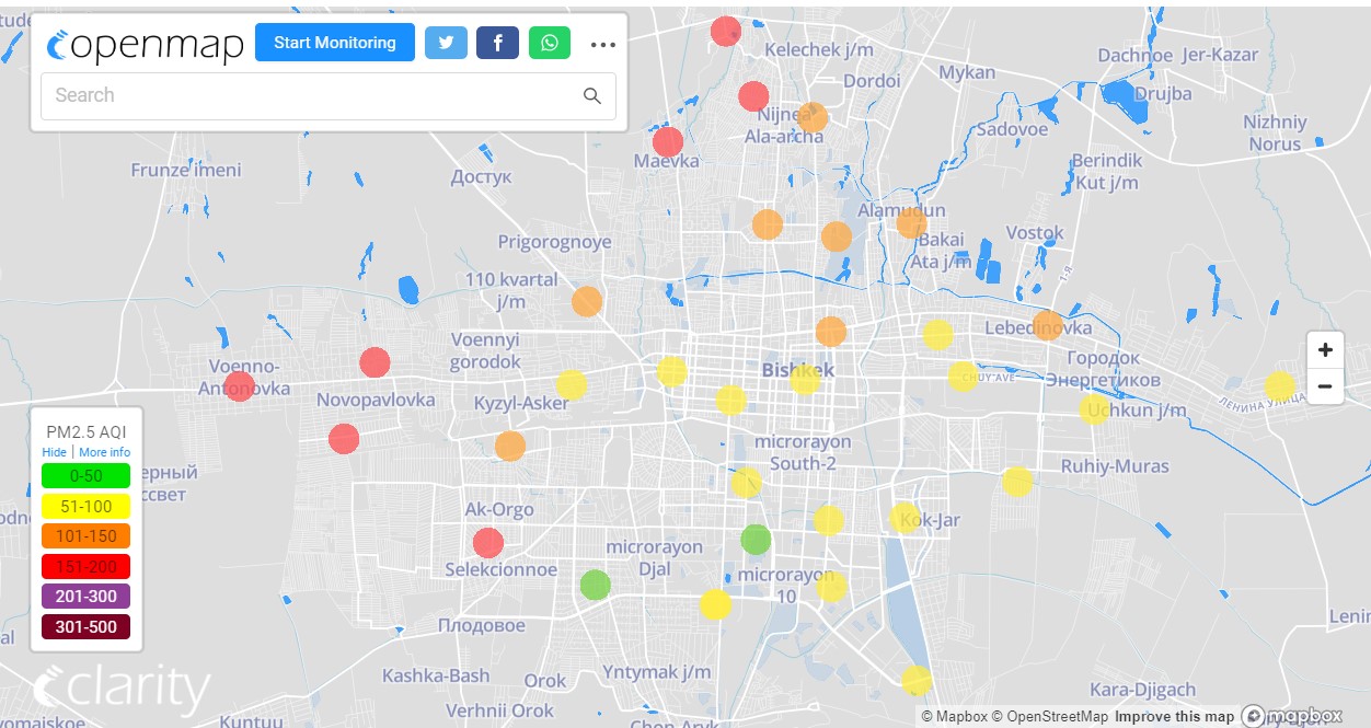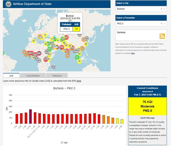 Посольство США в Кыргызстане также установило станцию. Информация обновляется каждый час. Индекс качества воздуха в районе дипломатической миссии «умеренный» — 76 (AQI).