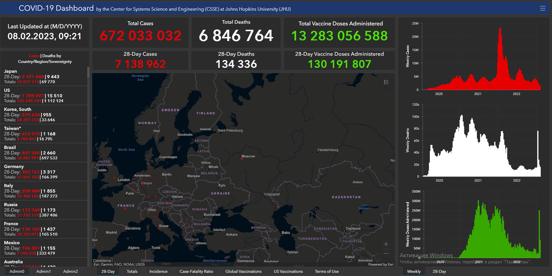 Всего в мире с начала пандемии коронавирусом заразились 672 миллиона 33 тысячи 32 человека. Больше всего в США (102 миллиона 645 тысяч 744), Индии (44 миллиона 683 тысячи 543), Бразилии (36 миллионов 887 тысяч 991), Франции (39 миллионов 753 тысячи 17), Великобритании (24 миллиона 526 тысяч 807), России (21 миллион 702 тысячи 774), Турции (17 миллионов 42 тысячи 722), Аргентине (10 миллионов 40 тысяч 329), Иране (7 миллионов 565 тысяч 25), Колумбии (6 миллионов 355 тысяч 135), Испании (13 миллионов 740 тысяч 531), Италии (25 миллионов 488 тысяч 166) и Германии (37 миллионов 861 тысяча 703).Количество смертей от коронавируса достигло 6 миллионов 846 тысяч 764. За сутки показатель вырос на 1 тысячу 344 человека. В том числе в США всего с начала пандемии скончались 1 миллион 112 тысяч 124 человека, Бразилии — 697 тысяч 533, Индии — 530 тысяч 745, Мексике — 332 тысячи 479, России — 387 тысяч 406, Великобритании — 217 тысяч 658, Италии — 187 тысяч 272.