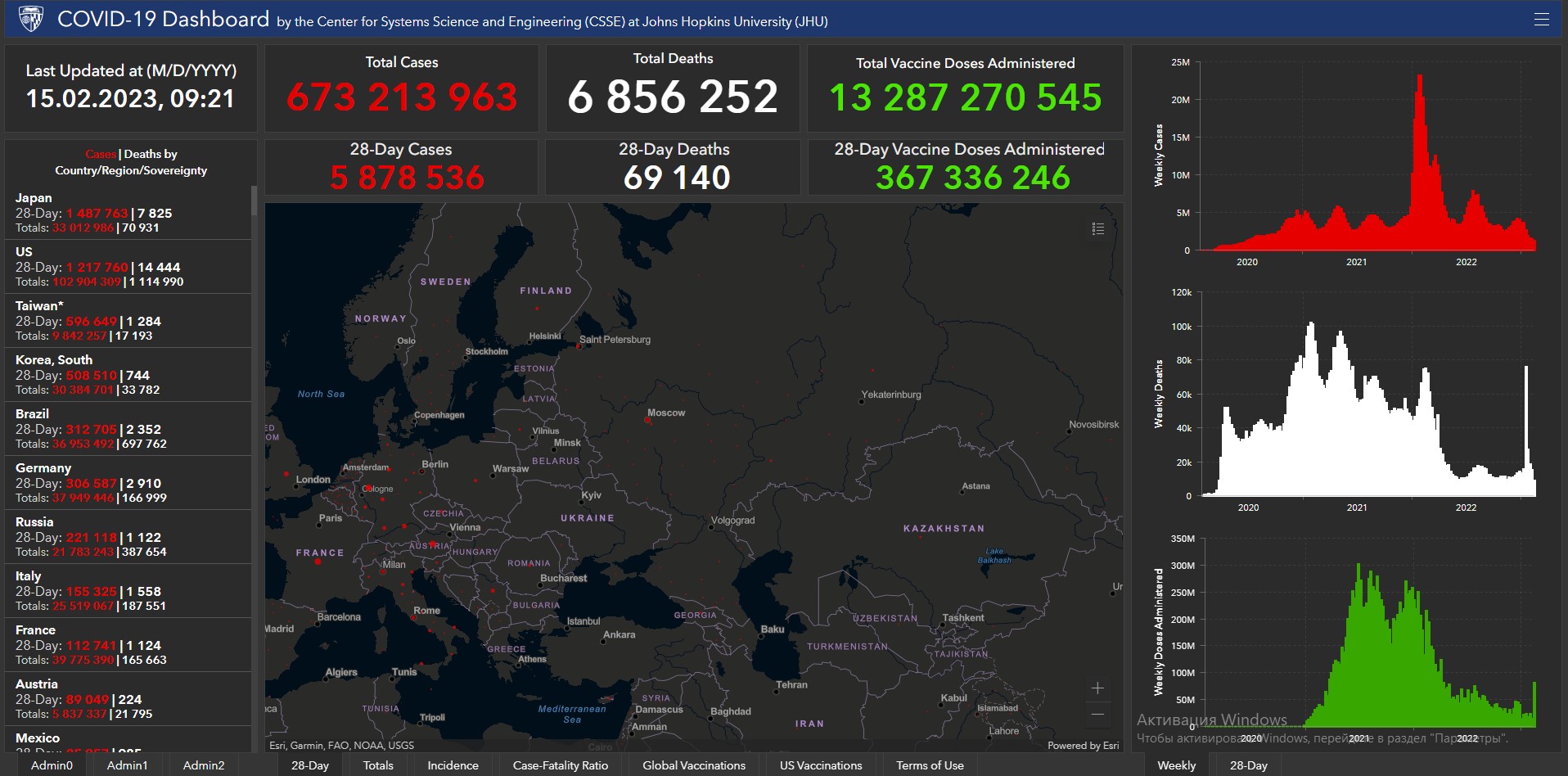 Всего в мире с начала пандемии коронавирусом заразились 673 миллиона 213 тысяч 963 человека. Больше всего в США (102 миллиона 904 тысячи 309), Индии (44 миллиона 684 тысячи 274), Бразилии (36 миллионов 953 тысячи 492), Франции (39 миллионов 775 тысяч 390), Великобритании (24 миллиона 549 тысяч 112), России (21 миллион 783 тысячи 243), Турции (17 миллионов 42 тысячи 722), Аргентине (10 миллионов 42 тысячи 136), Иране (7 миллионов 565 тысяч 865), Колумбии (6 миллионов 355 тысяч 637), Испании (13 миллионов 748 тысяч 918), Италии (25 миллионов 519 тысяч 67) и Германии (37 миллионов 949 тысяч 446).Количество смертей от коронавируса достигло 6 миллионов 856 тысяч 252. За сутки показатель вырос на 1 тысячу 288 человек. В том числе в США всего с начала пандемии скончались 1 миллион 114 тысяч 990 человек, Бразилии — 697 тысяч 762, Индии — 530 тысяч 753, Мексике — 332 тысячи 653, России — 387 тысяч 654, Великобритании — 218 тысяч 476, Италии — 187 тысяч 551.