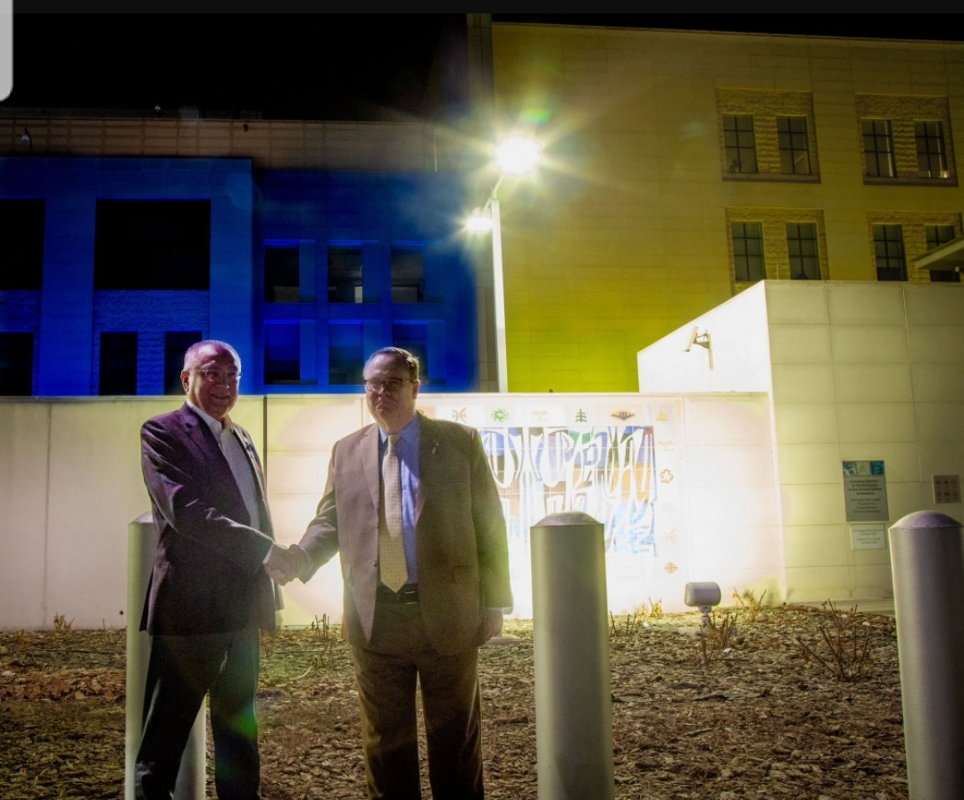 «Сегодня исполняется год с тех пор, как Россия начала жестокое полномасштабное вторжение в Украину. Послы Лесли Вигери и Валерий Жовтенко сфотографировались у здания диппредставительства, освещенного в сине-желтые цвета в ознаменование этой даты. Сегодня и каждый день мы поддерживаем Украину», — сообщили в посольстве.