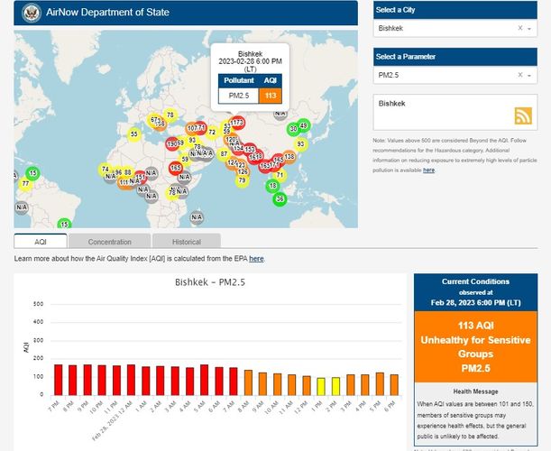 Посольство США в Кыргызстане также установило станцию. Информация обновляется каждый час. Индекс качества воздуха в районе дипломатической миссии «нездоровый для чувствительных групп» — 113 (AQI).