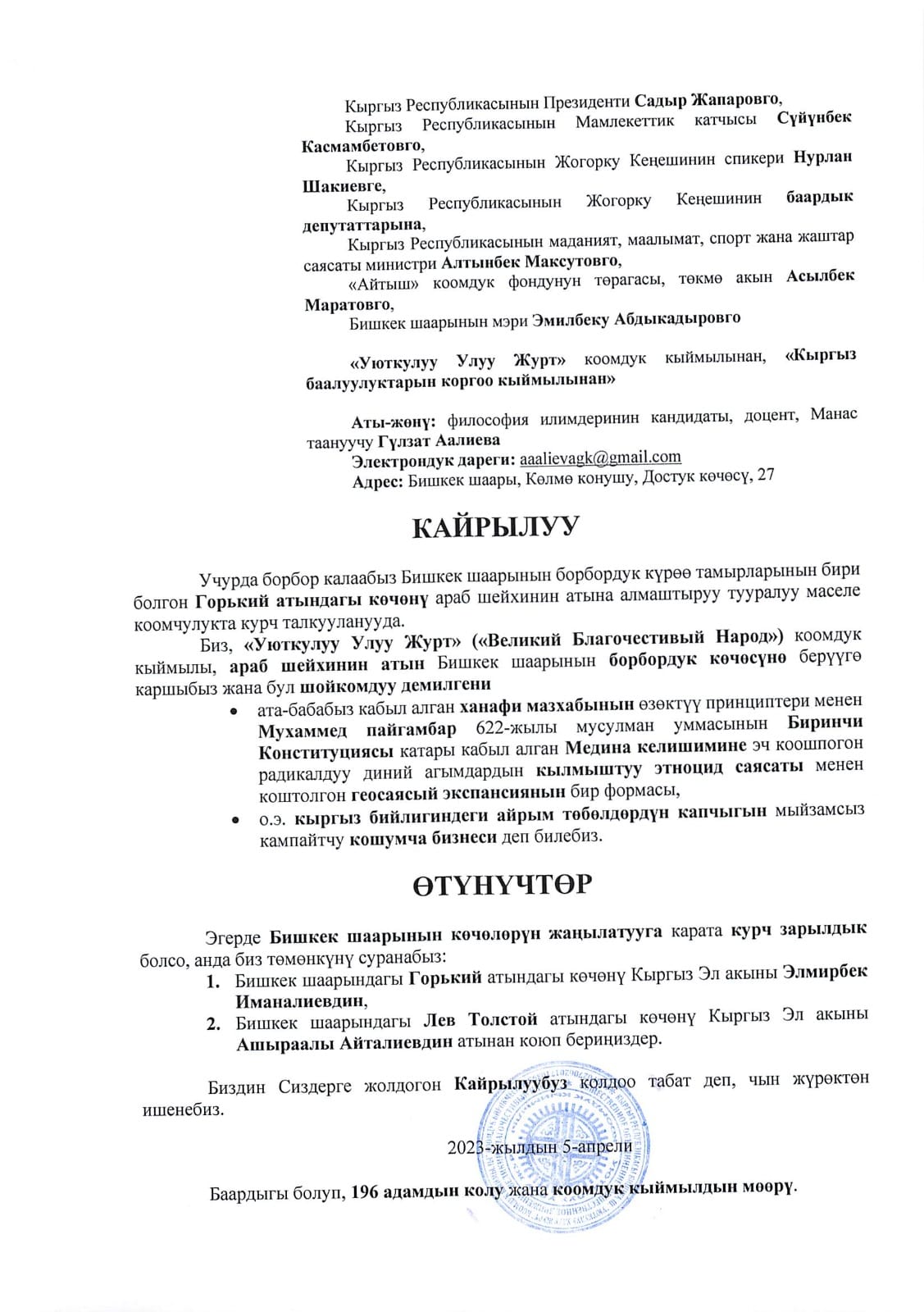 В письме, направленном президенту Садыру Жапарову, госсекретарю Суйунбеку Касмамбетову, спикеру Нурлану Шакиеву, депутатам парламента, министру культуры Алтынбеку Максутову, мэру Эмилбеку Абдыкадырову, председателю фонда «Айтыш» Асылбеку Маратову, говорится, что движение против переименования улицы Горького в честь основателя и первого президента Объединенных Арабских Эмиратов шейха Заида ибн Султана Аль Нахайяна.