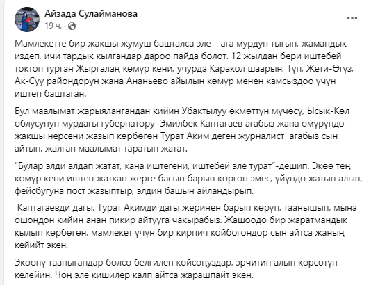 «Угольный разрез «Жыргалан», простаивающий 12 лет, сейчас начал работу по снабжению углем города Каракол, Тюпского, Джети-Огузского, Ак-Суйского районов и поселка Ананьево. После распространения этой информации член временного правительства Эмилбек Каптагаев и не написавший в жизни ничего хорошего журналист Турат Аким обрушились с критикой, заявили о распространении ложной информации. Ни один из них не был на шахте, они из дома написали посты в Facebook, которые взбудоражили народ. Печально, что критикуют те, кто в жизни не занимался ничем созидательным и ничего не внес в развитие страны», — написала Айзада Сулайманова.