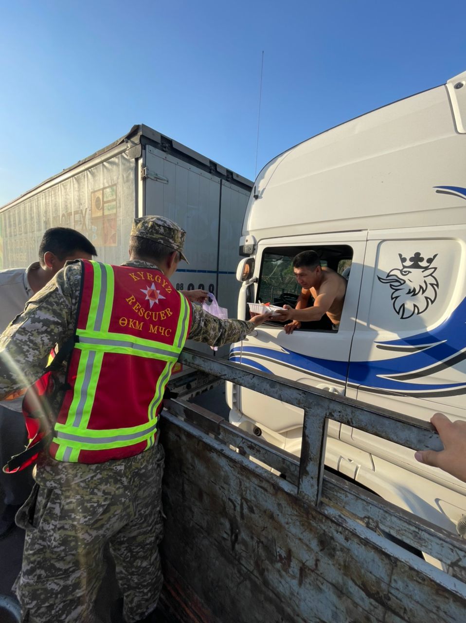 За обеспечение обедом отвечают сотрудники местных айыл окмоту и управления МЧС Чуйской области. Небезразличные граждане взяли на себя обеспечение водителей напитками.