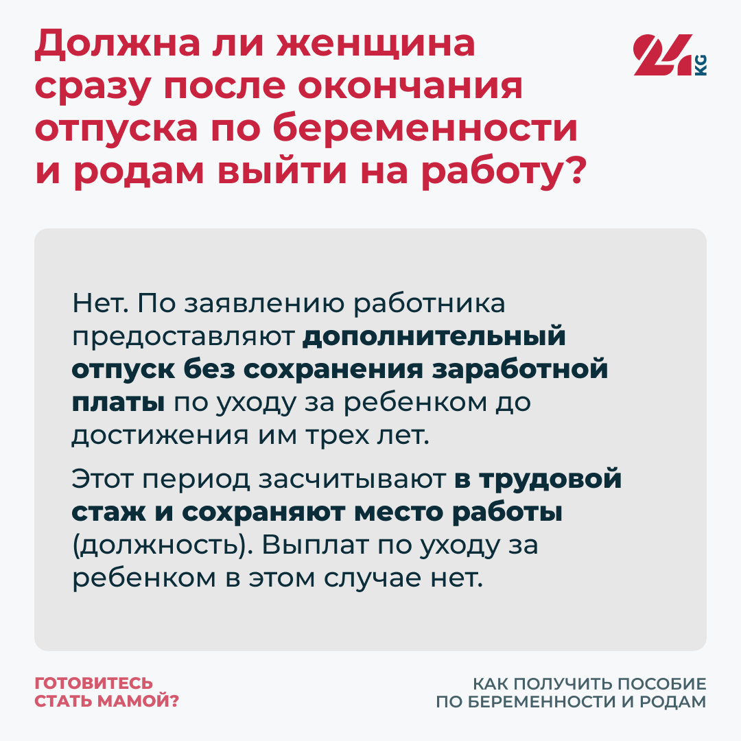 Размер пособия по беременности и родам, выплачиваемого за счет республиканского бюджета с 11-го рабочего дня, составляет 2 тысячи сомов в месяц. Однако финансовую поддержку от государства могут получить не все.