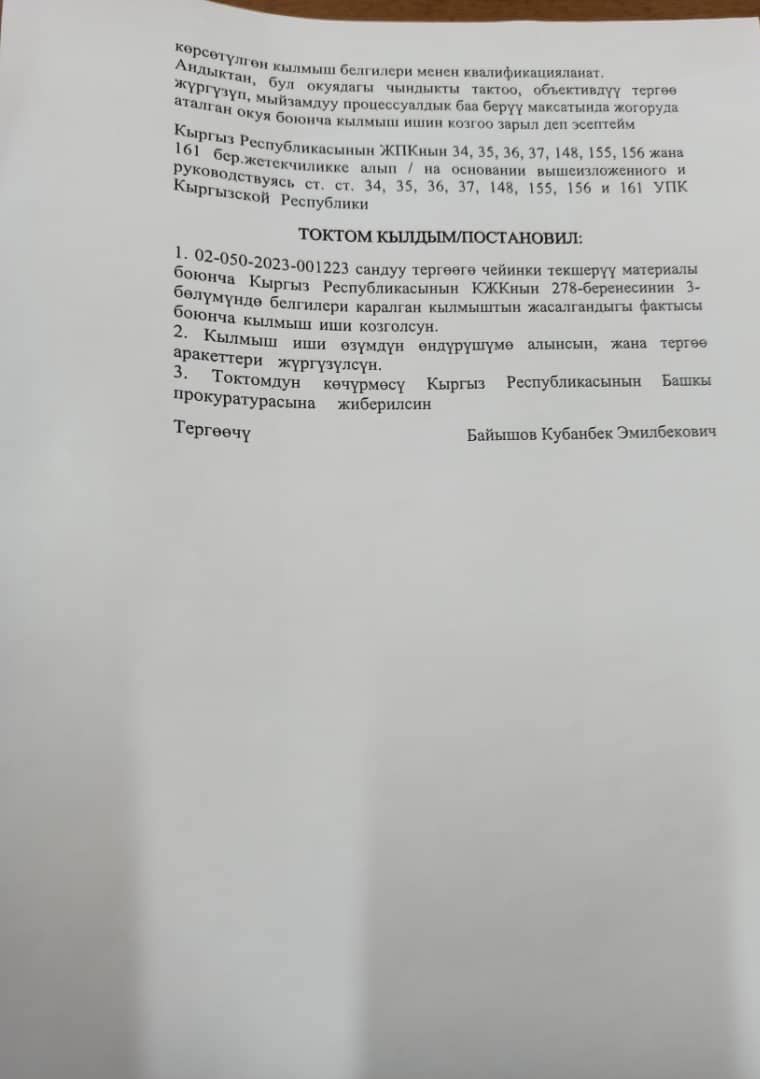 По факту возбуждено уголовное дело по статье 278 части 3 УК КР, а также начаты следственные мероприятия. Постановление подготовил следователь Кубанбек Байышов.