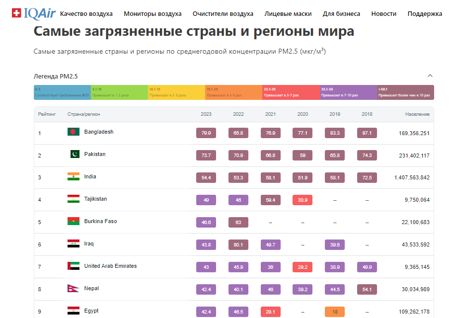 Страны с самым грязным воздухом — это Бангладеш, Пакистан и Индия. Там объем твердых частиц PM 2.5 превышает норму ВОЗ более чем в десять раз. В пятерку антирейтинга вошел и Таджикистан.