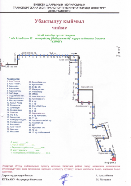 Из-за этого сегодня, 15 июня, временно изменили схему движения автобусного маршрута № 42. Он не будет ездить по участку улицы Абдрахманова — от Горького до Ахунбаева и на участке улицы Ахунбаева — от Байтика Баатыра до Юнусалиева.