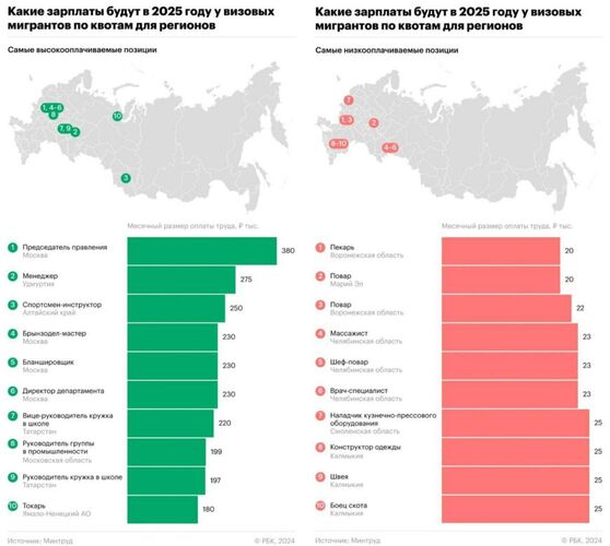 В 2025 году общероссийская квота на привлечение квалифицированных иностранных работников составит около 235 тысяч разрешений на работу. Самая высокая зарплата для иностранцев — 380 тысяч рублей в месяц, следует из заявок по регионам.