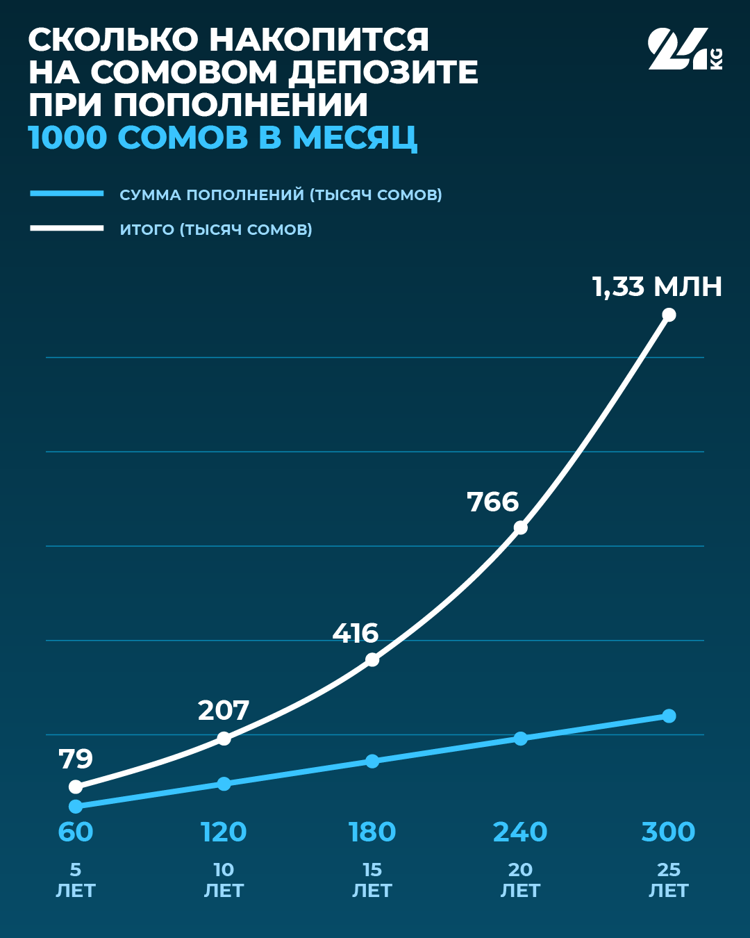 Конечно, чем раньше начать откладывать, тем лучше. Магия сбережений начинает работать со временем, то есть чем дольше срок — тем быстрее прирастает капитал. Например, если вы открыли банковский депозит под 11 процентов годовых с капитализацией процентов раз в год на 1000 сомов и пополняете его по 1000 сомов один раз в месяц, то через 5 лет вы соберете 79 тысяч, через 10 лет — 207 тысяч, а через 25 лет это будет уже почти 1,4 миллиона сомов. Сумма, отложенная вами, составит 300 тысяч сомов, а процент к ним превысит 1 миллион сомов. Чем выше срок накоплений, тем эффективнее работают ваши сбережения.