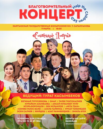Только раз в году на одной сцене собираются самые яркие звезды кыргызской эстрады, чтобы подарить вам незабываемый вечер и помочь тем, кто в этом нуждается. Весь доход от продажи билетов будет направлен в фонд Help the children-SKD.
