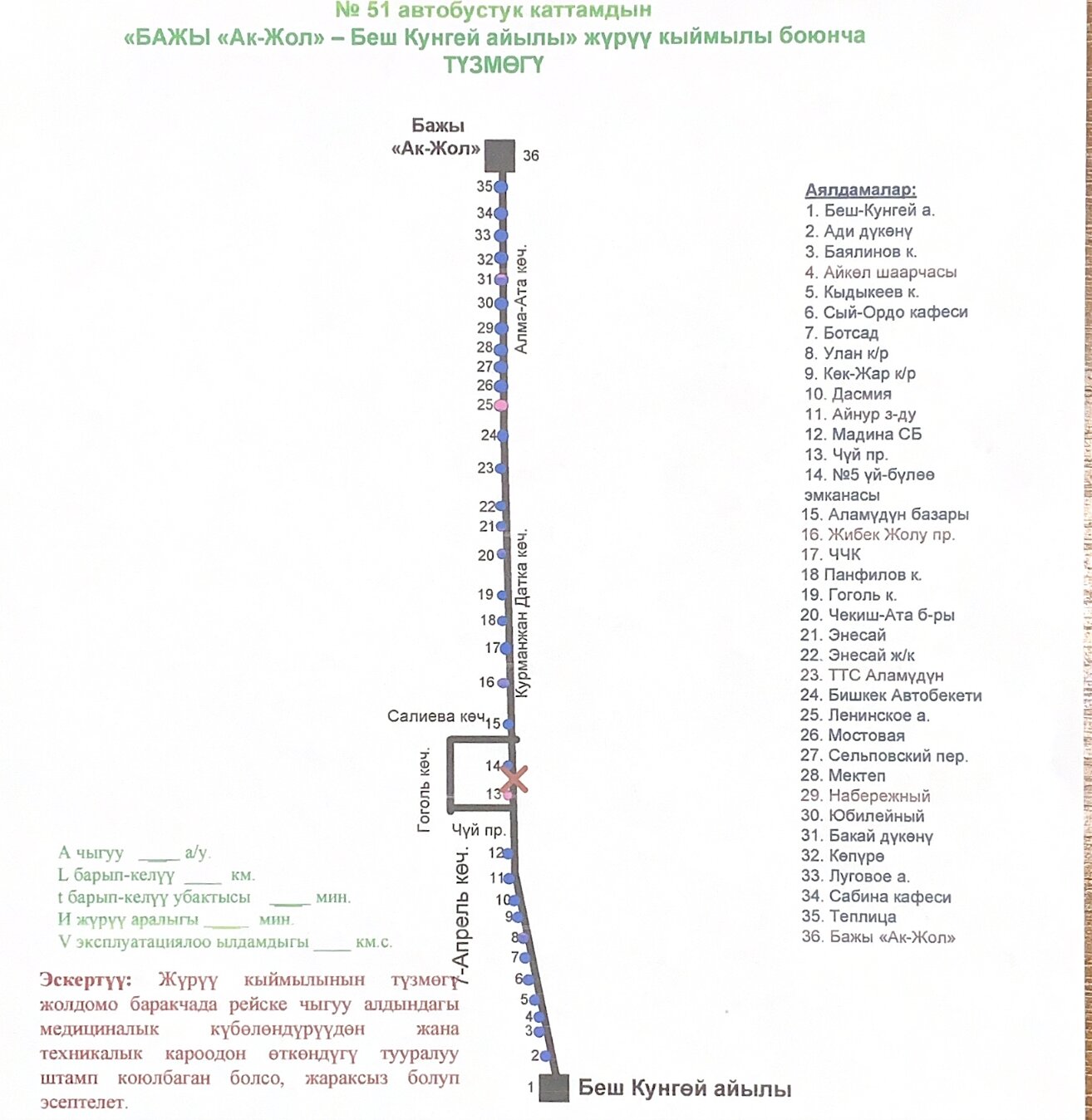 - автобусный маршрут № 51 будет следовать по улицам Курманджан Датки — Салиевой — Гоголя — проспекту Чуй;