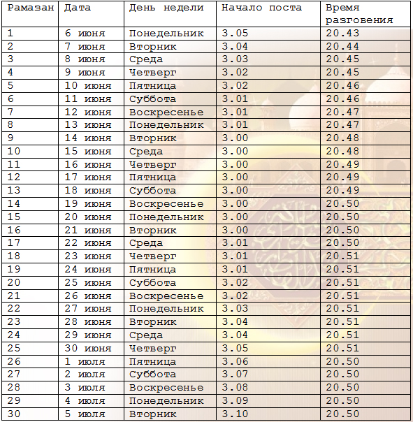 Календарь для соблюдающих пост в священный месяц Рамазан.