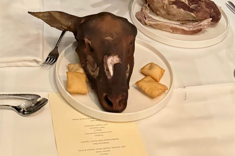 Но в традиционное для таких приемов изысканное меню я внес кочевую суть — баранину, подаваемую по древнему обычаю. То есть с устуканом и ритуальной головой, вручаемой старшему по возрасту из гостей в знак почтения и уважения.