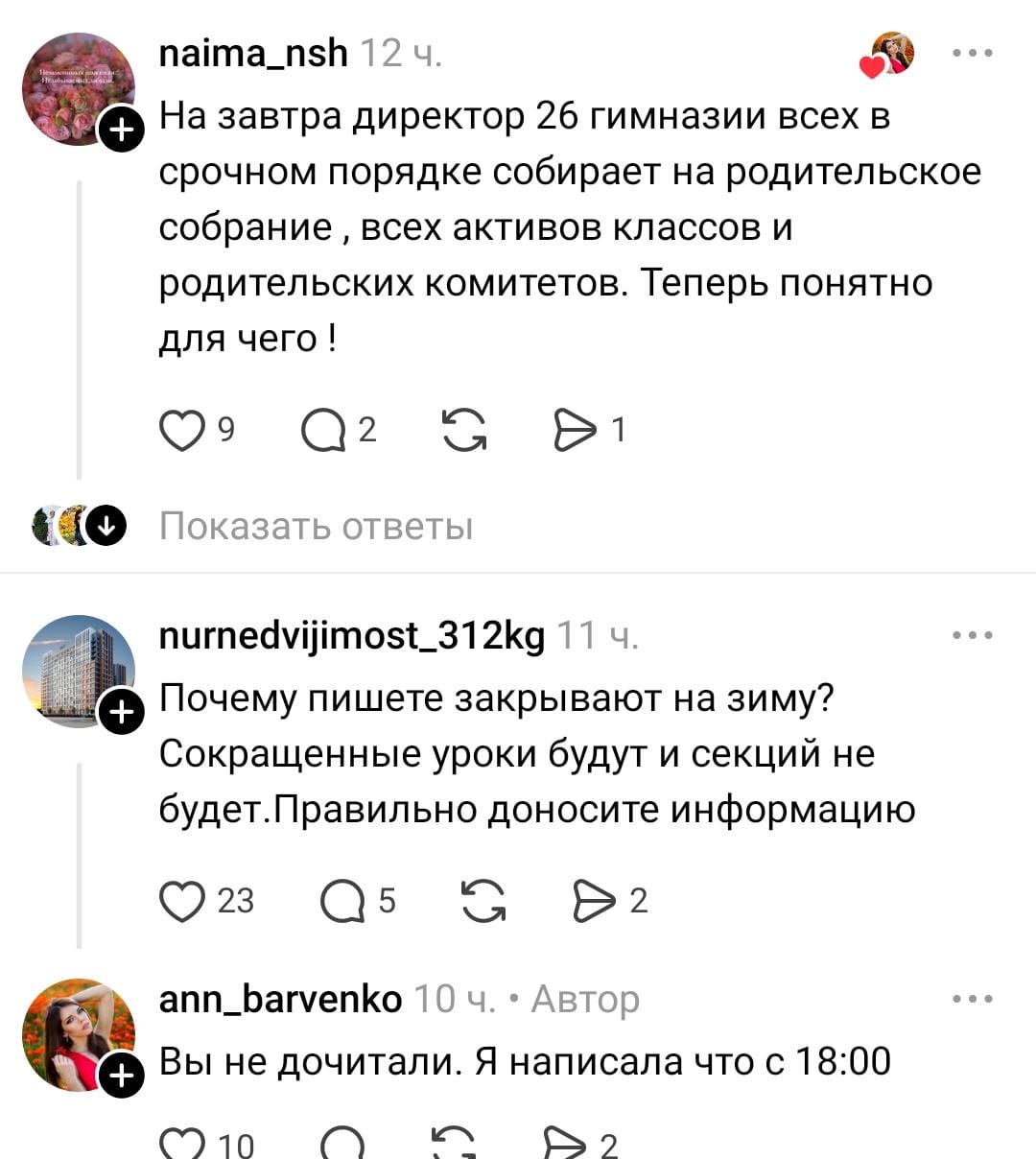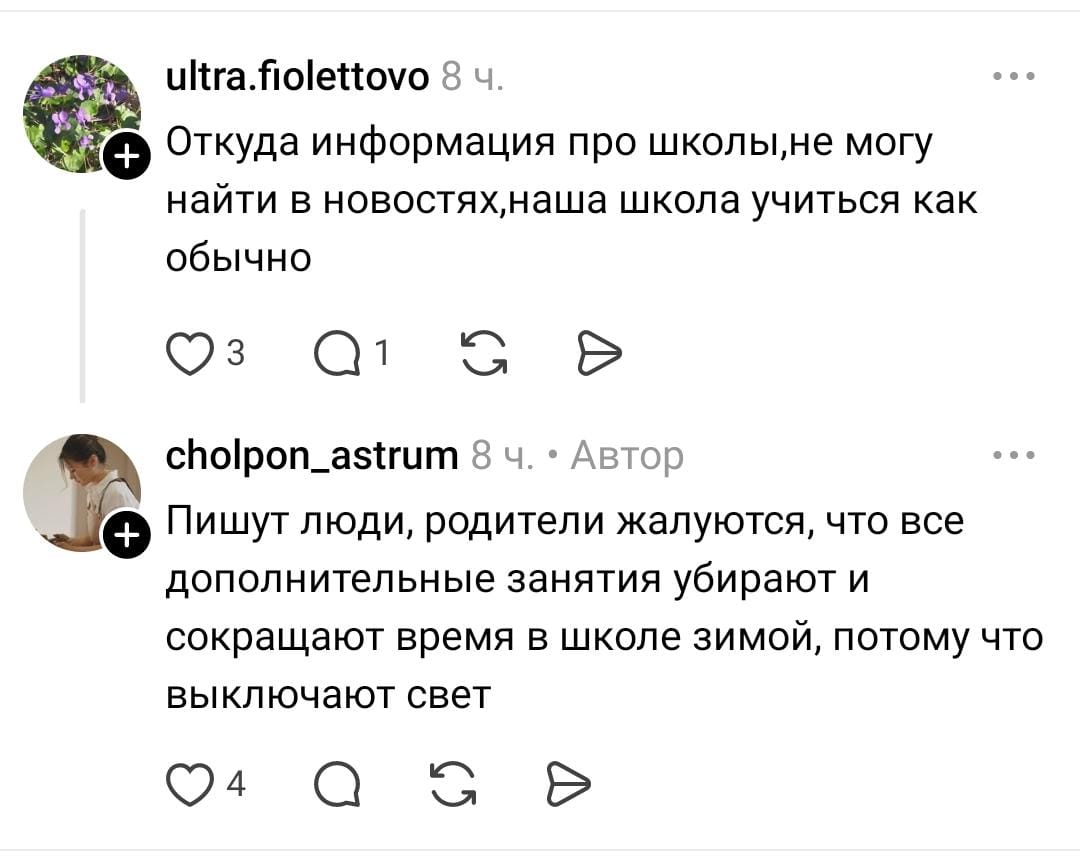 Отметим, в соцсетях появилась информация, что из-за энергокризиса в школах Бишкека после 18.00 якобы запрещают использовать электроэнергию. По словам родителей учащихся школы № 38, уроки во вторую смену шли до 19.00, поэтому их будут сокращать, как и послеурочные кружки и секции. Об этом их поставили в известность вчера на родительском собрании.