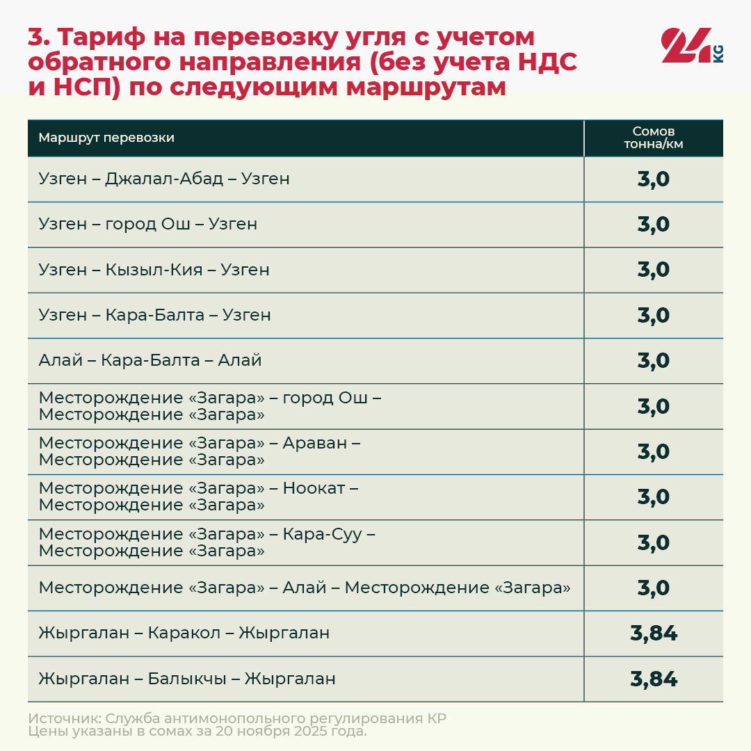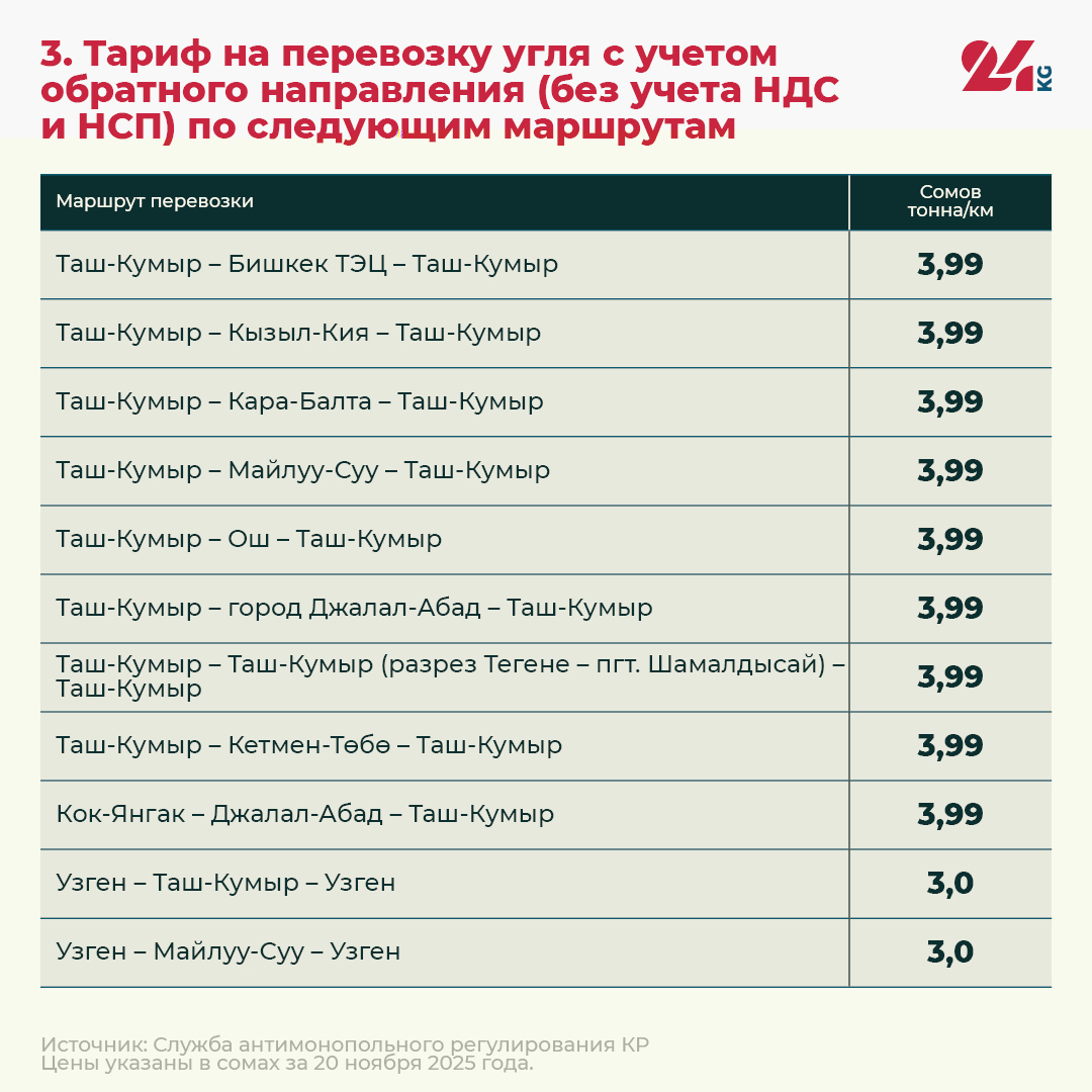 Помимо этого, установили стоимость перегрузки угля на железнодорожный транспорт на погрузочно-разгрузочной площадке Балыкчи. Тариф составляет 262,60 сома за тонну без учета НДС и НСП.