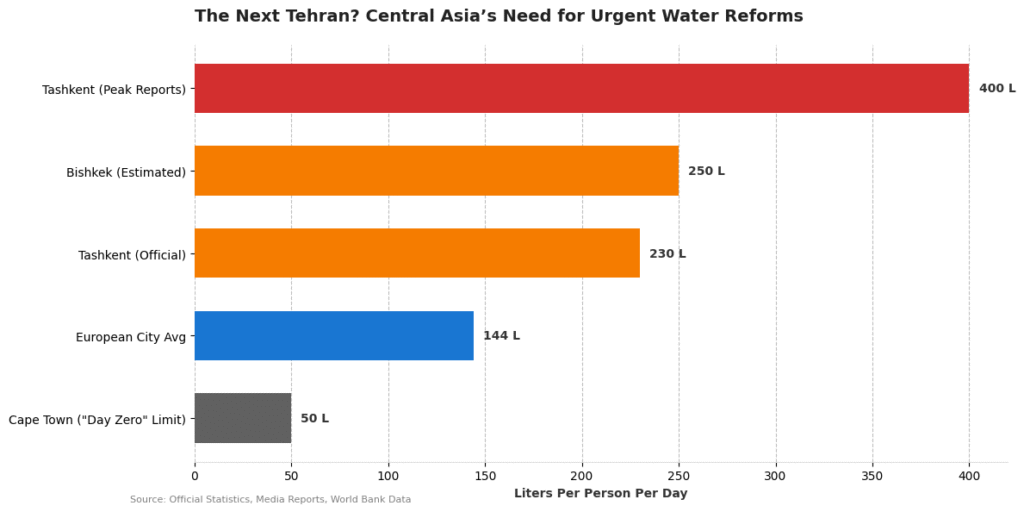 Отдельное внимание аналитики уделили столицам региона. Водопроводные сети Ташкента и Бишкека сохранились в основном с советских времен и часто держатся на аварийном ремонте. Потребление воды в Узбекистане — одно из самых высоких в мире: до 400 литров в сутки на человека, что почти вдвое больше, чем в европейских городах. Это делает крупные города крайне уязвимыми — даже небольшие перебои способны вызвать массовое отключение.
