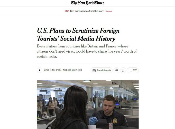 Отмечается, что Соединенные Штаты собираются проверять у въезжающих в страну туристов историю их активности в социальных сетях за период до пяти лет.