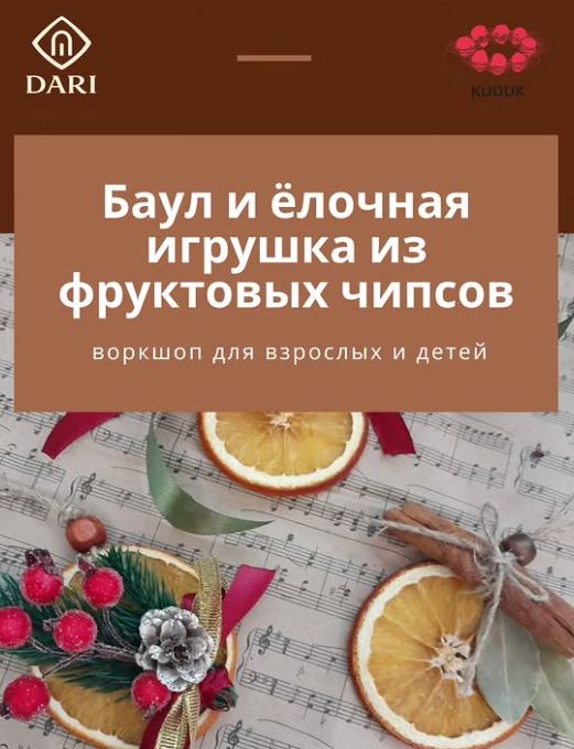 Приглашаем вас на теплый новогодний воркшоп, где мы будем собирать праздничный баул и создавать елочную игрушку из натуральных фруктовых чипсов — вместе, не спеша, с ощущением приближающегося праздника.