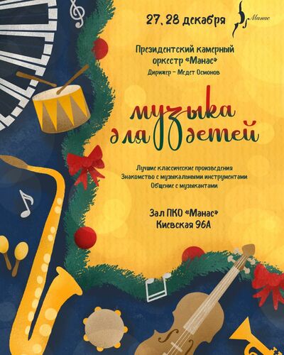 Вместе с президентским камерным оркестром «Манас» дети отправятся в увлекательное путешествие: услышат лучшие произведения мировых композиторов, музыку из любимых мультфильмов, познакомятся с инструментами оркестра. Дети смогут пообщаться с музыкантами оркестра и даже поиграть вместе с ними!